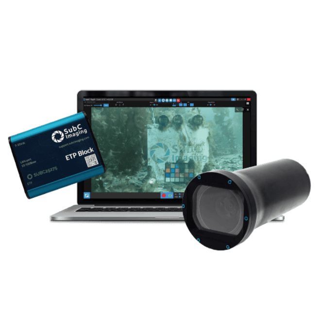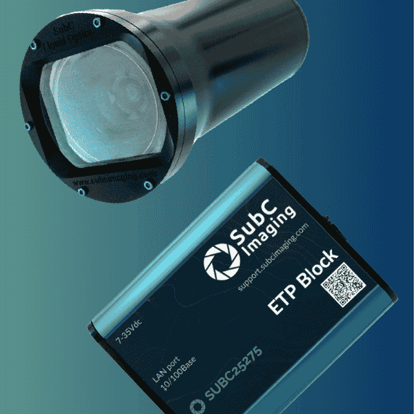 SubC Imaging Rayfin Uplink camera and ETP Block shown on a blue gradient background.